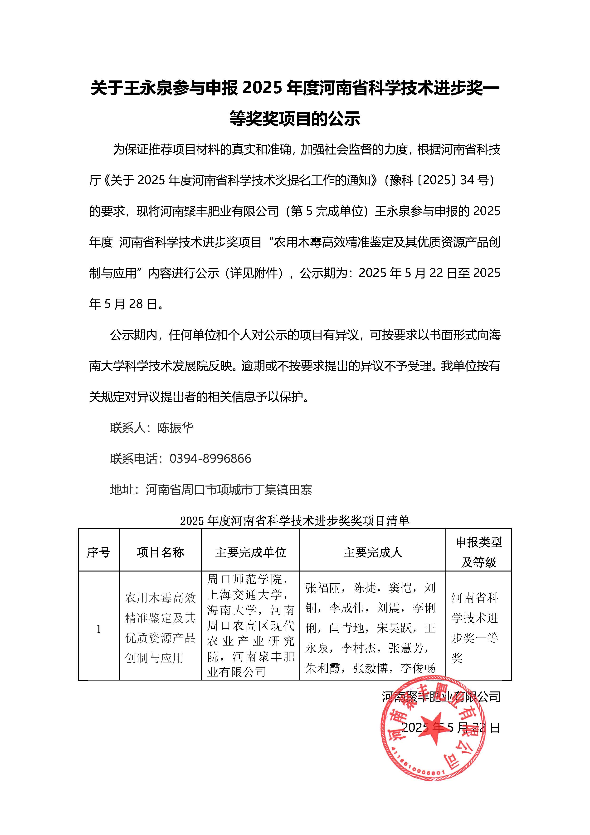 为保证推荐项目材料的真实和准确,加强社会监督的力度,根据河南省科技厅《关于2025年度河南省科学技术奖提名工作的通知》(豫科〔2025〕34号)的要求,现将河南聚丰肥业有限公司(第5完成单位)王永泉参与申报的2025年度 河南省科学技术进步奖项目“农用木霉高效精准鉴定及其优质资源产品创制与应用”内容进行公示(详见附件),公示期为:2025年5月22日至2025年5月28日。